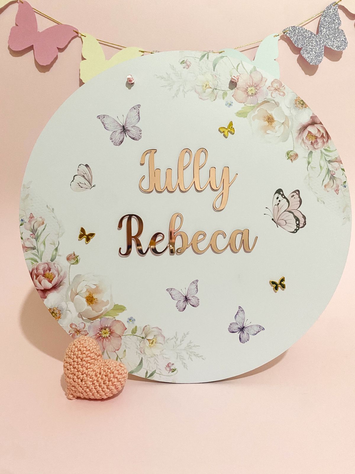 - Nome e Borboletinhas em Acrílico Espelhado Rosé